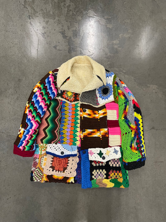BLUESIN’S “CROSSTOWN TRAFFIC” PATCHWORK CROCHET SHERPA LINED DENIM RANCH COAT